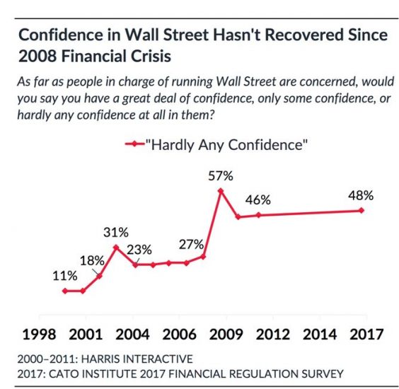 Figure 1 – Pourcentage de Américains qui n’ont « presqu’aucune confiance » dans Wall Street, 1998-2017. Source : Cato Institute.