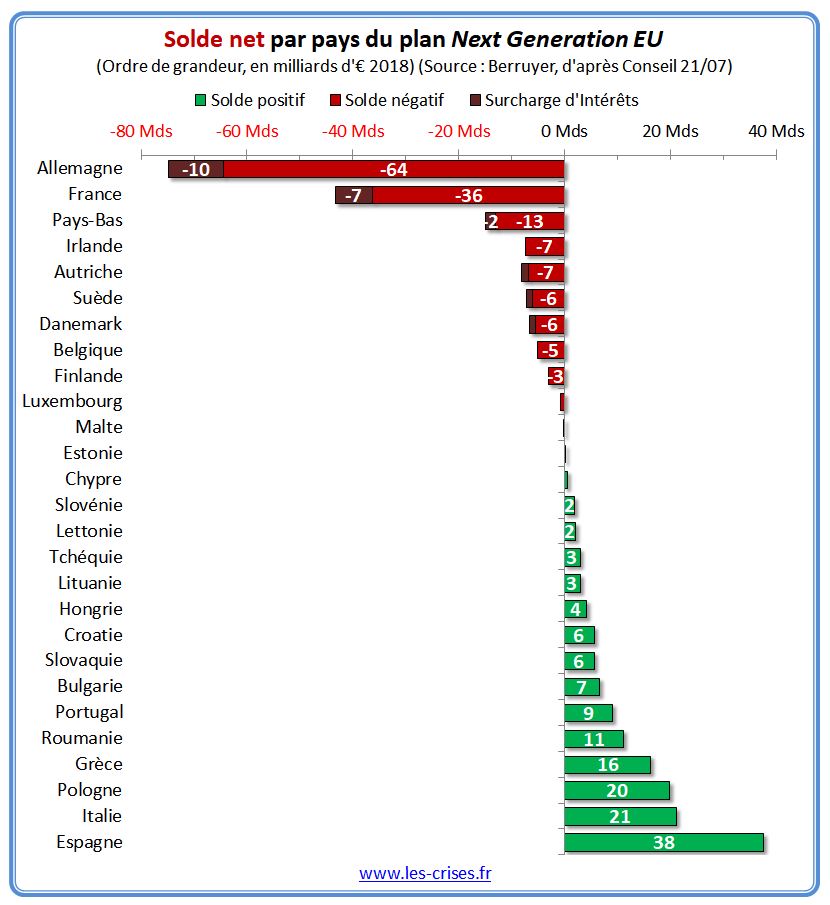 AlerterOlivier, vous vous offusquez de ce que la France paie au terme de ce plan beaucoup plus que ce qu’elle pourrait recevoir à terme. France, Allemagne, Italie etc.. ne sont d’une part plus vraiment des entités souveraines, d’autre part n’appartiennent pas à un ensemble réellement intégré. Le « processus de la construction européenne » est en panne sèche depuis quelques années. Nous sommes au milieu du gué. Nous avons quitté notre port d’attache en abandonnant souveraineté monétaire, commerciale, budgétaire.. etc..mais sans atteindre le port de destination : une UE intégrée fiscalement et économiquement dont en réalité personne ne veut en Europe. Les élites atlantistes ouest européennes ont forgé leur identité dans ce « projet européen » mort né sous sa forme actuelle. Elles ne peuvent y renoncer. En résumé, ce plan de « relance » suppose pour qu’il soit acceptable que l’UE soit beaucoup plus intégrée qu’elle ne l’est aujourd’hui. C’est simplement une forme de coup de force visant a forcer le chemin vers cette UE rêvée/phantasmée, réalisation qui ne peut plus avoir lieu qu’en passant par une forme de violence, qu’elle soit financière ou institutionnelle, puisqu’elle est démocratiquement rejetée. Pour les élites technocratiques non élues qui ont approuvé ce « plan de relance » il n’y a là, dans leur monde, aucune raison de s’offusquer.