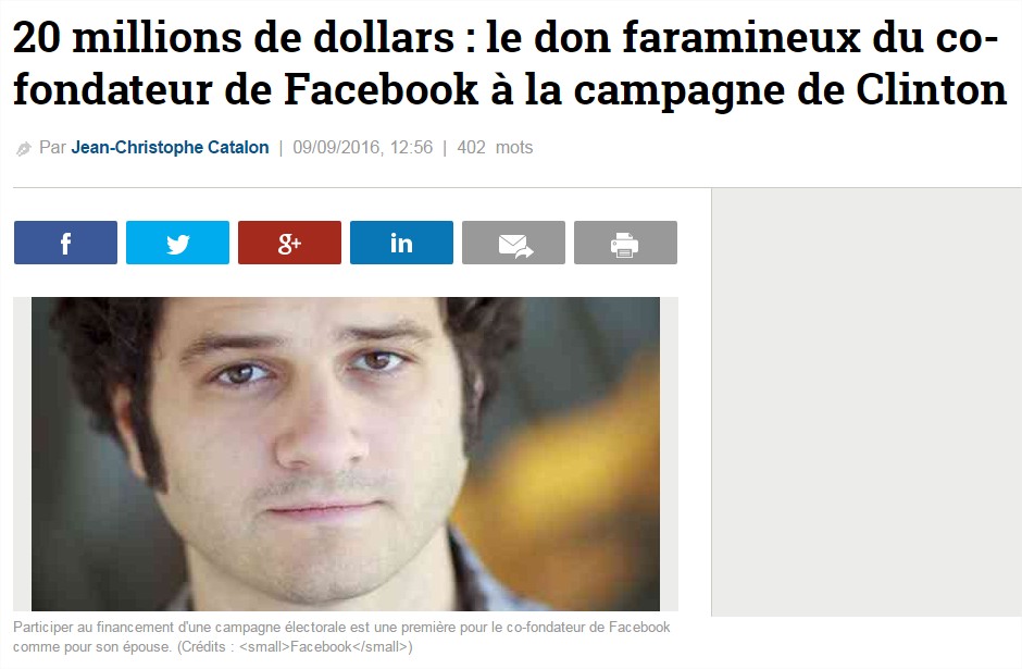 Alors que l’échéance de l’élection présidentielle se rapproche outre-Atlantique, Hillary Clinton vient de recevoir un soutien financier de poids. Dustin Moskovitz, le co-fondateur de Facebook, et sa femme Cari Tuna ont signé un chèque de 20 millions de dollars pour la campagne de la candidate du Parti démocrate, selon le site d’information américain Tech Crunch.