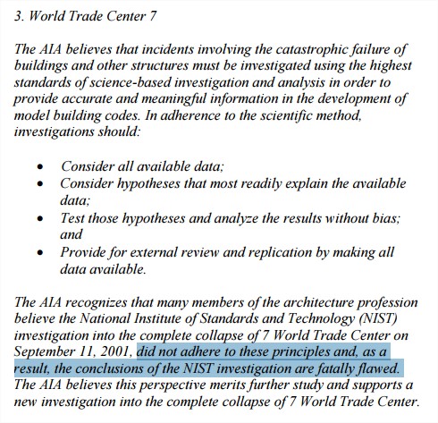 En mai 2015, des architectes truthers ont réussi à faire mettre à l’ordre du jour de l’Assemblée générale de la prestigieuse association American Institute of Architects une résolution dénonçant le manque de qualité de l’enquête du NIST et demandant une nouvelle enquête sur l’effondrement du WTC7 :