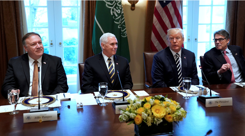 Le président américain Donald Trump, entouré du directeur de la CIA Mike Pompeo (à gauche), du vice-président Mike Pence et du secrétaire à l’énergie Rick Perry (à droite), accueille le prince héritier Mohammed ben Salmane d’Arabie saoudite pour un déjeuner de travail à la Maison-Blanche à Washington, le 20 mars 2018.