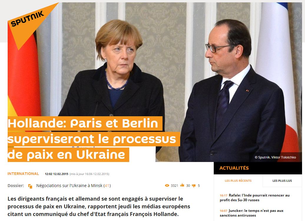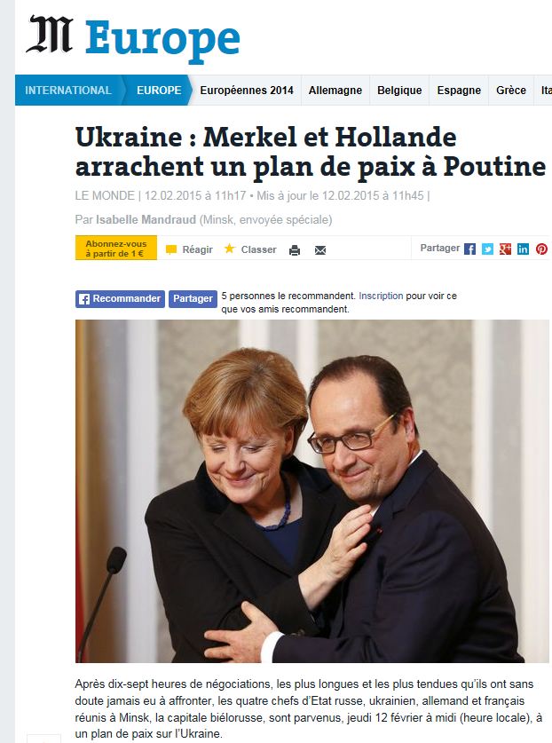 AlerterLe plus important c’est la compréhension européenne des enjeux et des résultats de la soumission aux USA contre ses propres intérêts. L’important aussi c’est qu’en 13 heures de contact ils ont compris que Poutine cherche l’alliance et non pas l’expansionnisme. Merkel et Hollande ne peuvent plus revenir en arrière et ils sont contraints de porter et forcer la paix quoi qu’il arrive. Maintenant que 3 (Merkel, Poutine et Hollande) sur 4 y sont allés pour sauver la paix avec au bout un début de résultat dans ce sens, ils sont engagés pour réussir. Quel discours peut maintenant tenir celui qui s’y oppose ? Il n’est déjà plus question de Crimée. Quelle justification aux sanctions maintenant si ce n’est la seule volonté de guerre économique des USA.