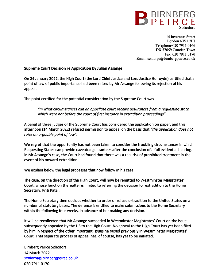 Le 24 janvier, la Haute Cour avait laissé à la Cour suprême le soin de déterminer si elle accorderait l’autorisation d’examiner l’appel sur une question juridique, à savoir que les assurances données par les États-Unis au tribunal d’instance auraient dû être données pendant l’audience du tribunal inférieur en septembre 2020 et non après. Après l’interdiction de l’extradition d’Assange pour des raisons de santé, les États-Unis ont donné à la Grande-Bretagne des assurances diplomatiques qu’ils ne placeraient pas Assange sous le régime d’incarcération le plus sévère, à savoir les mesures administratives spéciales (SAM), et qu’il recevrait des soins de santé physique et mentale adéquats.