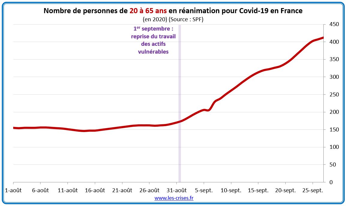 Si la proportion de personnes de 20 à 65 ans avec comorbidités hospitalisées pour Covid avait été la même en août et en septembre, on aurait dû voir une hausse de + 40 % de leur nombre en réanimation, identique à celui des hospitalisations. Comme la hausse a été de + 175 %, les comorbidités expliquent donc déjà + 135 % de l’augmentation des personnes de 20 à 65 ans en réanimation. C’est bien sûr un minimum, puisque ce critère explique aussi une partie de la hausse des hospitalisations.