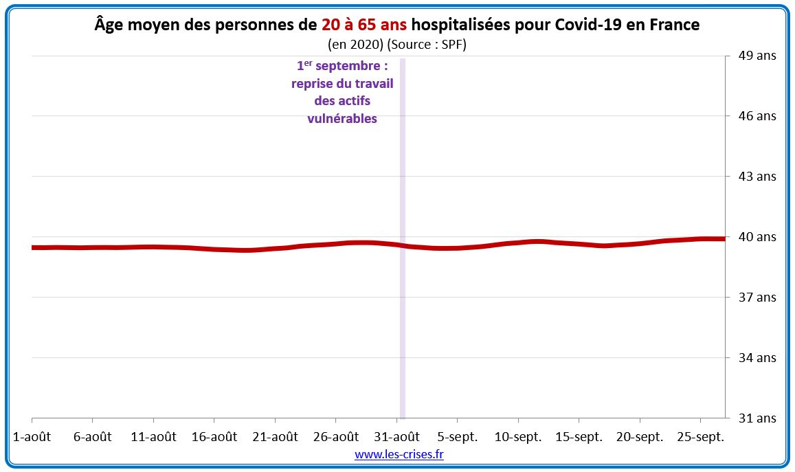 Cela signifie donc que les personnes de 20 à 65 hospitalisées en septembre sont beaucoup plus à risque de forme grave que celles hospitalisées en août. Comme les deux principaux facteurs de risque sont l’âge et les comorbidités, voici l’évolution de l’âge moyen des personnes de 20 à 65 ans hospitalisées pour Covid-19 :