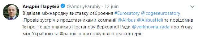 « J’ai visité le Salon international de Défense et de Sécurité terrestres et aéroterrestres #Eurosatory @cogeseurosatory. J’ai rencontré des représentants de la compagnie @Airbus @AirbusHeli et je les ai informés que j’ai signé la décision du Conseil suprême @verkhovna_rada sur l’accord entre l’Ukraine et la France au sujet de l’achat des hélicoptères. » (source, archive)