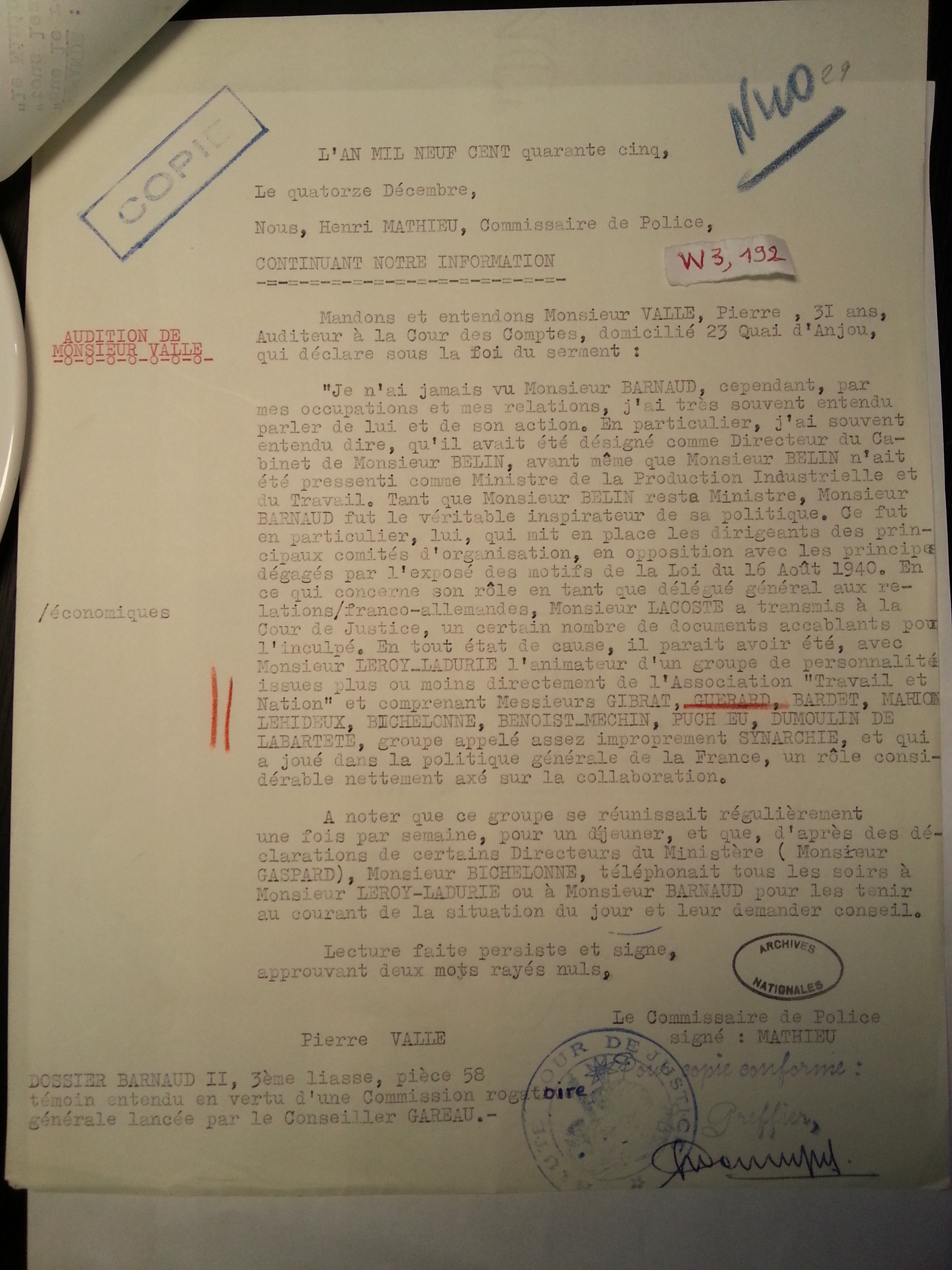 L’appui unanime qu’a reçu Olivier Dard des historiens issus d’une institution universitaire naguère respectueuse des archives ne peut s’expliquer que par la droitisation générale du corps, l’expiation d’un passé parfois progressiste, la dépendance grandissante à l’égard des financements extérieurs, notamment patronaux et européens, tous facteurs qui ont aboli l’étude scientifique des élites de l’argent. Comment désormais agréer la seule idée que celles-ci aient fomenté un « complot contre la République », sous la houlette de leur fraction financière la plus concentrée, regroupée en « synarchie »((Quelques copies d’archives sur « la synarchie-qui-n’existe-pas ». Noms cités, pour la plupart des personnages de premier plan Abetz, (hauts magistrats de la Haute Cour de Justice ; hauts fonctionnaires de la police ; Raymond Brugère, ambassadeur de France et secrétaire général du Quai d’Orsay (deuxième personnage du ministère des Affaires étrangères) en septembre-octobre 1944, cf. index de mes op. cit. à la note 21.1. Traduction télégramme 674 Abetz sur synarques, Paris, 27 février 1941, 3 p., 3W, 222-2. Original télégramme 674 Abetz sur synarques, Paris, 27 février 1941, 3 p., 3W, 222-3. Rapport Chavin, mai 1941, 18 p., 3W, 192-4. Guérard, chef synarque, 28 février 1942, 2 p., 3W, 192-5. Perquisition Boudet, synthèse sur 95 fiches synarques, 19 septembre 1944, 2 p., 3W, 192-6. 95 fiches synarques, 19 septembre 1944, 5 p., 3W, 192-7. Audition Pétain sur synarchie par Béteille, 3 p., 19 mai 1945, 3W, 192-8 (1,2). Brugère, extrait Veni, vidi, Vichy sur synarchie, 1945, 4 p., 3W, 192-9. Audition Pierre Vallé sur synarchie, 14 décembre 1945, 1 p., 3W, 192-10. Présentation couverture 5 auditions diverses sur synarchie, 1945, 1 p., 3W, 192))?
