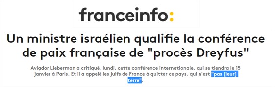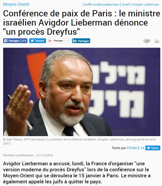 Benyamin Nétanyahou a déjà annoncé qu’il ne viendrait pas. Lundi, le ministre de la défense israélien, Avigdor Lieberman, a lui comparé ce sommet à « une version moderne du procès de Dreyfus », lors d’une réunion des députés de son parti. « Il n’y a qu’une différence entre ce qu’ils prévoient à Paris [et l’affaire Dreyfus], la dernière fois qu’il n’y avait qu’un seul Juif sur la tribune et maintenant tout le peuple d’Israël et tout l’État d’Israël », a-t-il ajouté.