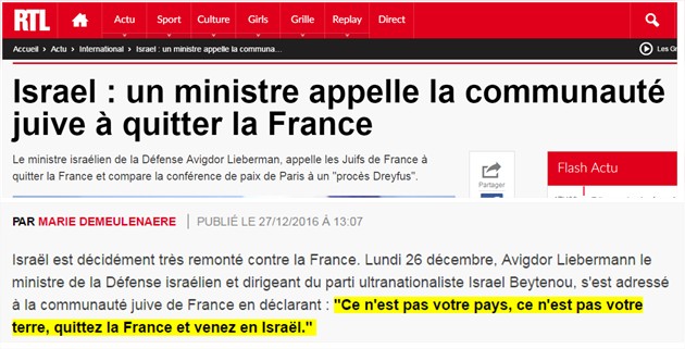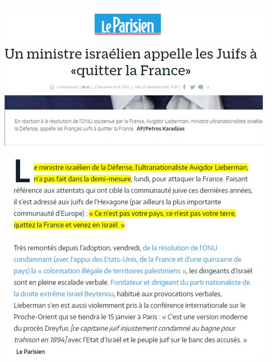 Lieberman a également profité de l’occasion pour exhorter la communauté juive de la France à déménager en Israël. « Ce sera peut-être aussi le moment pour dire aux Juifs français : « Ce n’est pas votre pays, ce n’est pas votre terre. Quittez la France et venez en Israël !« C’est la seule réponse à ce complot. C’est ce que c’est – un complot, pas une initiative [de paix]. Avec toutes les difficultés que cela entraîne, si vous voulez rester juif et vous assurer que vos enfants et petits-enfants restent juifs, quittez la France et faites votre Aliyah en Israël. »