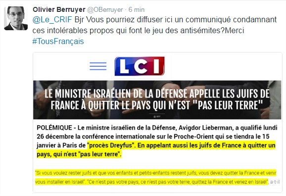 Rien sur le fil Twitter du Crif le 27/12 au soir – je me suis permis une petite alerte :