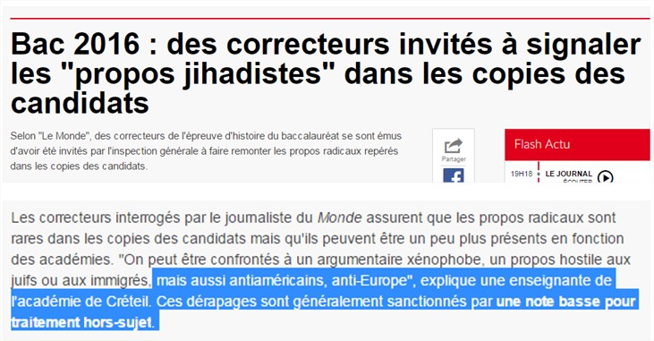 1) d’une directive de signaler des propos djihadistes dans les copies (on peut se demander ce qu’on fera de tels signalements… mais on ne peut pas non plus tout dire)…