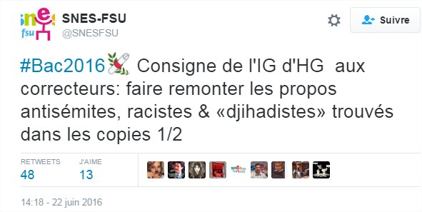 C’est une consigne qui passe mal. Selon le Syndicat national des enseignements de second degré (SNES-FSU), l’inspection générale d’histoire-géographie (IGHG) a demandé aux correcteurs de l’épreuve d’histoire de l’édition 2016 du baccalauréat de « faire remonter les propos antisémites, racistes et jihadistes trouvés dans les copies » des candidats. Le syndicat majoritaire des professeurs du secondaire s’en est ému sur Twitter le 22 juin, rappelant dans la foulée que « les enseignants sont des fonctionnaires responsables et compétents qui n’ont pas besoin d’appel à la délation pour accomplir leur travail », rapporte Le Monde ce mercredi 6 juillet.
