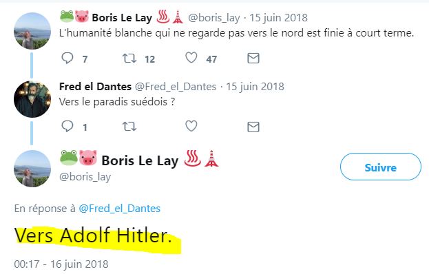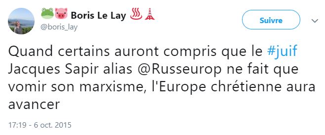 Evidemment Boris Le Lay est un grand malade, un genre de disciple de Céline. Ceci dit que dire de ceux qui le lisent en se repaissant de sa prose ? Cette analyse fort juste ne convaincra pas ceux qui sont dans cette mouvance. Vous pouvez dire ce que vous voulez, ils diront toujours que vous êtes manipulés, menteurs, et payés par les Juifs. Pour Bruno Le Lay, c’est comme pour Céline, tous ses ennemis sont juifs, et s’ils sont catholiques ce sont des juifs camouflés. Rappelez vous Céline qui désignait Racine ou encore Louis XIV comme des juifs. cette bêtise à al fois opportuniste et crapuleuse malheureusement je en crois pas qu’elle puisse se changer.