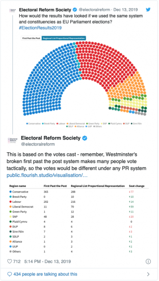 Des chercheurs du cercle de réflexion Electoral Reform Society ont démontré vendredi qu’avec un système de vote à la proportionnelle, les résultats auraient été tout autres.