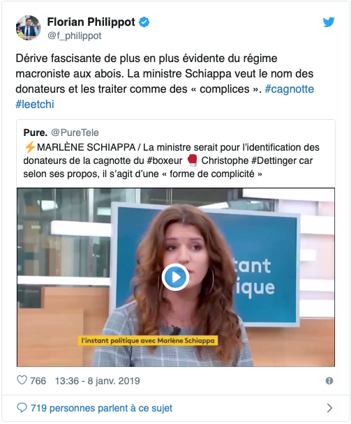 Des propos très critiqués sur les réseaux sociaux, tout particulièrement dans les rangs des soutiens des gilets jaunes. L’ancien numéro 2 du FN et eurodéputé Florian Philippot, qui s’est rallié à l’essentiel des revendications du mouvement contestataire, a conspué sur Twitter une « dérive fascisante de plus en plus évidente du régime macroniste aux abois ».