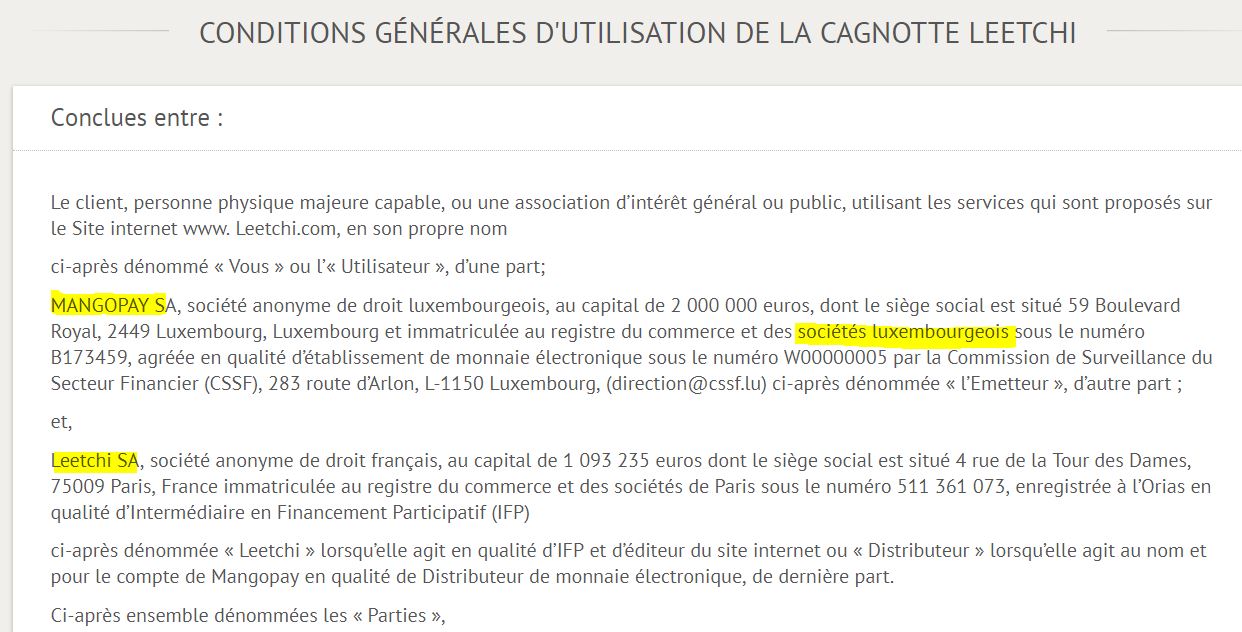 (Vous notez que Leetchi comprend en fait 2 structures, la structure de gestion de la monnaie a été créée au… Luxembourg – pour la qualité de son air sans doute…)