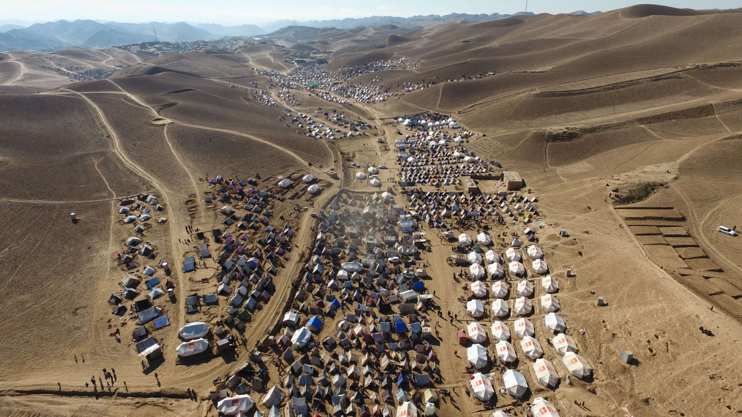 Dans un campement à Badghis, en Afghanistan, vidéo de tentes de familles déplacées en raison de la sécheresse et du changement climatique filmée par un drone. Il y a des milliers de maisons de fortune réparties entre les collines à la périphérie de la ville de Qala-i-naw. (Source : CNRC/Enayatullah Azad)