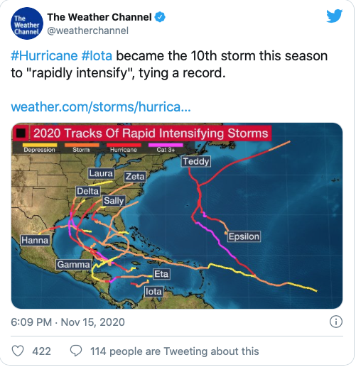 Six des sept derniers systèmes ont connu une intensification rapide – définie comme une augmentation des vents de 56 km/h en 24 heures. Ce qui serait inhabituel à n’importe quel moment de l’année, mais le fait qu’il s’agisse exclusivement de systèmes de l’alphabet grec, puisqu’ils se sont tous produits si tard dans la saison, rend la chose d’autant plus singulière.