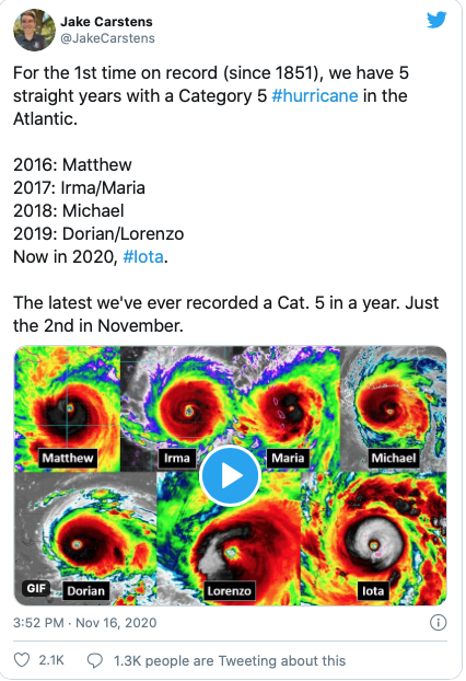 Jusqu’à mi-novembre, une case n’a pas encore été cochée pour cette saison, c’est celle des ouragans de catégorie 5. Cela a changé lorsque les vents de l’ouragan Iota ont atteint 260 km/h. C’est la tempête la plus violente jamais enregistrée à une date aussi tardive de la saison cyclonique dans l’Atlantique.