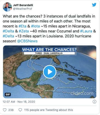 Et dans ce qui est peut-être le plus effrayant des cas, deux ouragans ont touché terre à quelques kilomètres l’un de l’autre à trois reprises : Laura et Delta en Louisiane, Delta et Zeta dans le Yucatan au Mexique, et Eta et Iota au Nicaragua.