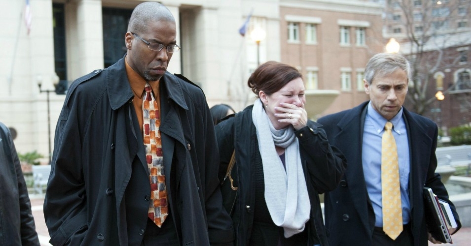 L’ancien agent de la CIA Jeffrey Sterling, à gauche, quitte le palais de justice fédéral d’Alexandrie le 26 janvier 2016 avec sa femme Holly, au centre, et son avocat Barry Pollack, après avoir été reconnu coupable des neuf chefs d’accusation pour avoir divulgué des informations confidentielles à un journaliste. Photo : Kevin Wolf/AP