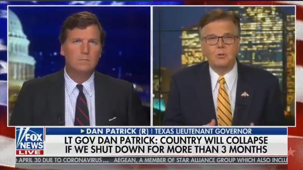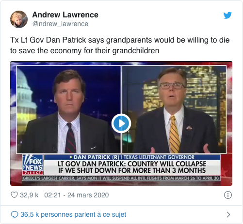 Dan Patrick, lieutenant-gouverneur du Texas (équivalent de vice-gouverneur), a estimé que les grands-parents, comme lui, devaient être prêts à mourir pour sauver l’économie du pays.