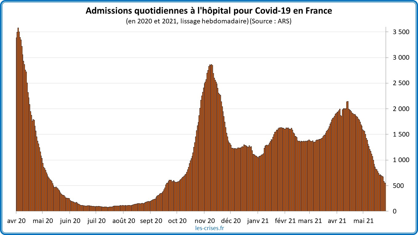 La tendance sur les admissions à l’hôpital pour Covid-19 est désormais en forte chute, et s’approche enfin des 500 hospitalisations par jour :