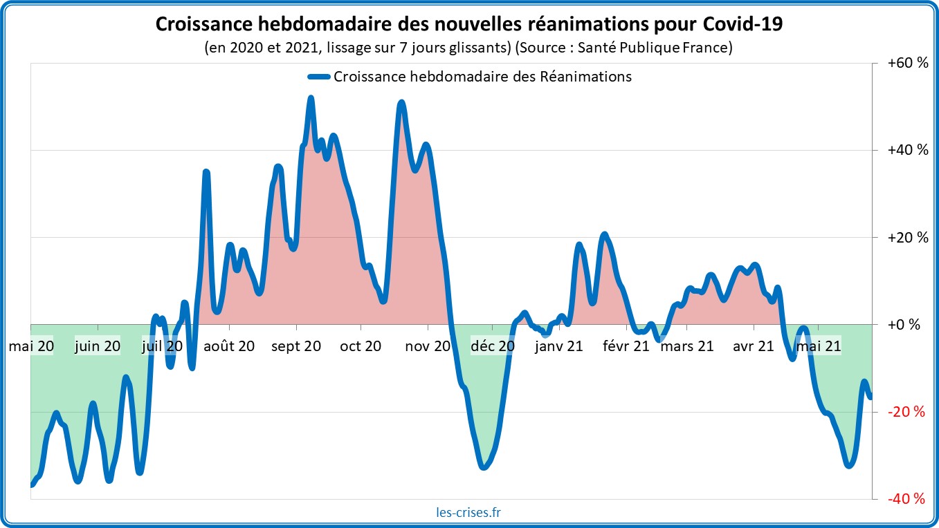 Lecture : quand la courbe bleue est sur fond rouge, l’épidémie est en croissance ; quand elle est sur fond vert, elle est en décroissance. Quand la courbe monte, l’épidémie accélère, quand elle descend, elle décélère.