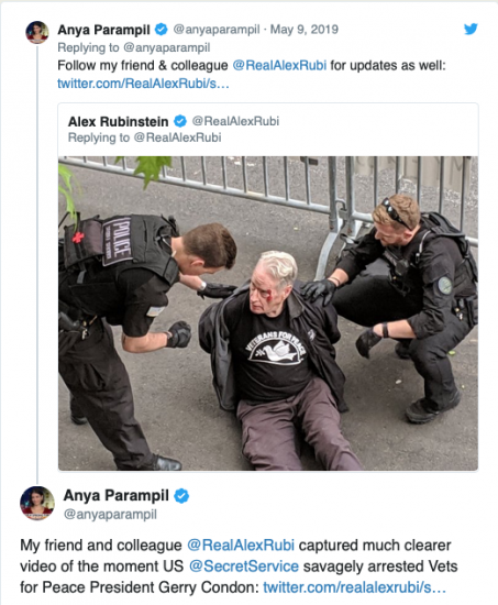 Gerry Condon, Président de Veterans for Peace [Les Vétérans pour la Paix, NdT], fut conspué et traîné dans la boue, ce mercredi soir pour avoir tenté d’apporter de la nourriture aux personnes confinées dans l’ambassade vénézuélienne à Washington. Les militants postés en son sein, dont certains ont vécu dans l’ambassade des semaines durant avec la permission du gouvernement vénézuélien, protègent les locaux, face à des manifestants qui soutiennent le président auto-déclaré Juan Gaido.