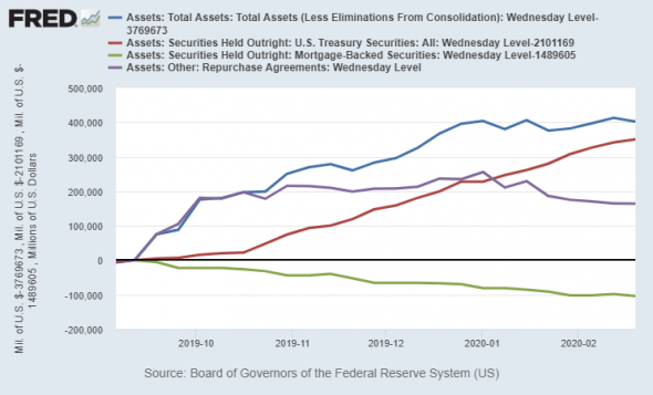 Entre septembre et décembre 2019, la Fed a rapidement élargi son bilan par une combinaison de rachats de titres et de T-bills.