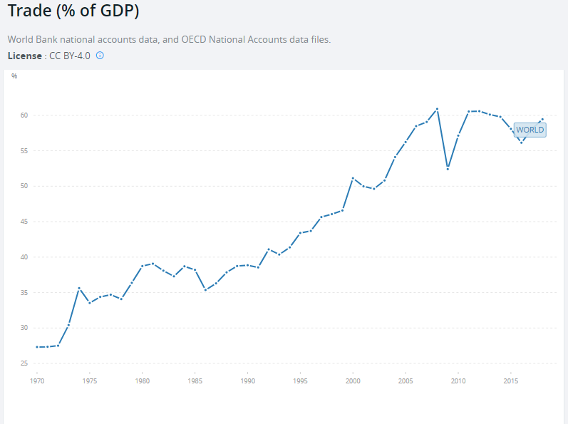 Le pourcentage du commerce international dans le PIB mondial – Source : Banque mondiale