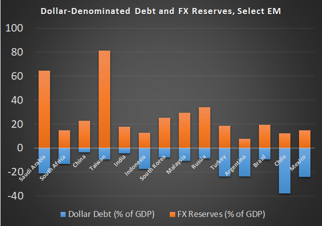 Et voici un tableau, appuyé par des données de la BRI et de banques centrales diverses, montrant les dettes libellées en dollar et les réserves de change en pourcentage de PIB, pour une sélection de marchés émergents.