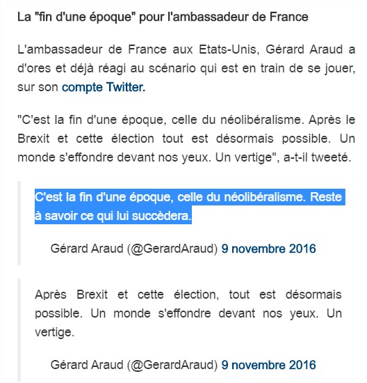 Et aussi dans sa seconde partie juste après : … »L’élection de Trump, c’est le triomphe de l’élite du Big Business contre celles de Washington. Il n’y a AUCUNE défaite des élites, juste le triomphe de l’une par rapport à l’autre« …