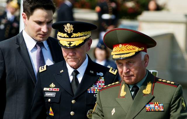 L’une des constantes dans les affaires américaines depuis la chute de l’URSS a été d’entretenir des relations d’armée à armée avec la Russie. Après 1991, les USA ont dépensés des milliards de dollars pour aider la Russie à sécuriser son arsenal nucléaire, y compris lors d’une opération ultra secrète qui consistait à déplacer de l’uranium enrichi à des fins militaires depuis des dépôts non sécurisés au Kazakhstan. Ces programmes conjoints pour superviser la mise en sécurité de matériaux à usage militaire se sont poursuivis au cours des 20 années suivantes. Pendant la guerre menée par les États-Unis en Afghanistan, la Russie autorisa son survol par des transporteurs et des ravitailleurs américains, ainsi que le transit terrestre pour le flux d’armes, de munitions, d’eau et de nourriture dont la machine de guerre américain avait quotidiennement besoin. L’armée russe fournit des renseignements sur les déplacements d’Oussama Ben Laden, et aida les États-Unis à négocier le droit d’utiliser une base aérienne au Kirghizstan L’État-Major Interarmes a toujours été en contact avec ses homologues syriens, et les liens entre les deux armées sont opérationnels jusqu’au plus haut niveau. En août, quelques semaines avant sa retraite de chef de l’État-Major Interarmes, Dempsey fit une visite d’adieu au quartier général des forces de défense irlandaises à Dublin, et raconta à son auditoire qu’ils avaient mis un point d’honneur, lorsqu’il était en fonction, à garder le contact avec le chef de l’État-Major russe, le Général Valery Gerasimov. « En fait, je lui ai suggéré que nous ne terminions pas notre carrière comme nous l’avions commencée » a-t-il dit – celle d’un commandant de char en Allemagne de l’Ouest, et l’autre à l’Est.