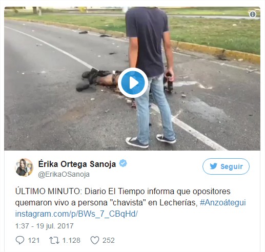 On ne verra pas trop des manifestants d’extrême-droite mettre le feu à un jeune passant noir de 21 ans soupçonné d’être un chaviste (Source) :