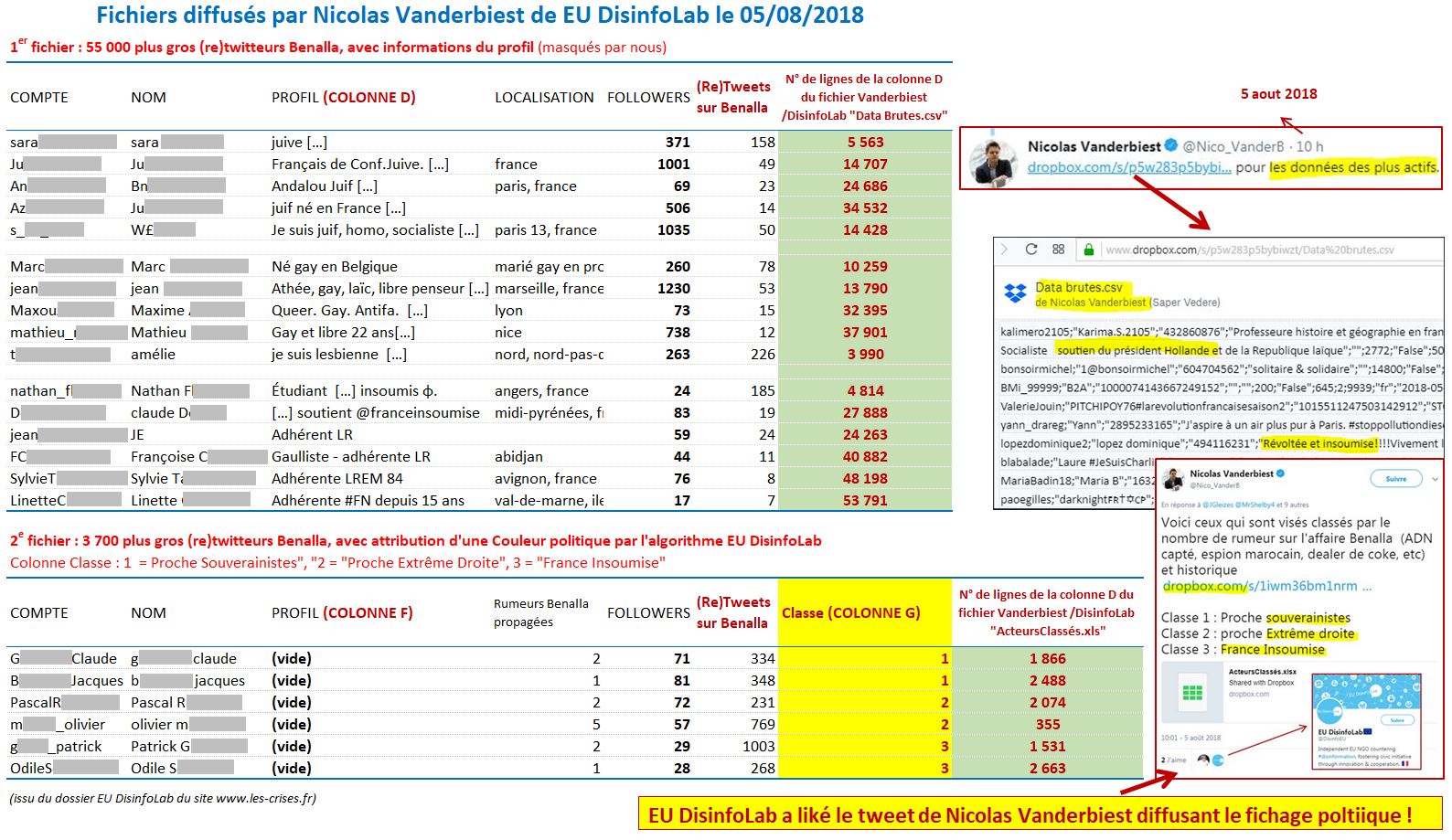 Le 5 août, Nicolas Vanderbiest, fondateur d’EU DisinfoLab, a alors diffusé sur Twitter les 2 fichiers (« Data brutes.csv » pour les 55 000 et « ActeursClassés.xlsx » pour le fichage politique), qui ont alors circulé sur Twitter – ne tenant pas compte des demandes pressantes de suppression du fichier (exemples ici, ici, ici ou ici). Il a fini par supprimer les fichiers 4 jours après, suite à une masse de plaintes à la CNIL, qui s’est saisie du dossier. EU DisinfoLab a alors diffusé, via dl.free.fr, un fichier zip comprenant 2 fichiers « allégés », lien donné sur Twitter (26 fois…) et dans leur étude Benalla, sans données personnelles ni politiques (« Data brutes 1 – 47.xlsx » et « Rumeurs & items.xlsx »), mais comprenant le nombre de rumeurs supposément diffusées par les plus de 3 000 acomptes très actifs, avant de supprimer également ces fichiers sur dl.free.fr le 9 aout à 18h38 (source : étude Benalla DisinfoLab).