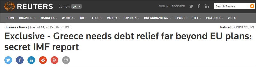 Exclusif : la Grèce a besoin de l’allégement des dettes bien au-delà des plans de l’Union Européenne – le rapport Secret du FMI – Reuters 14/07/2015