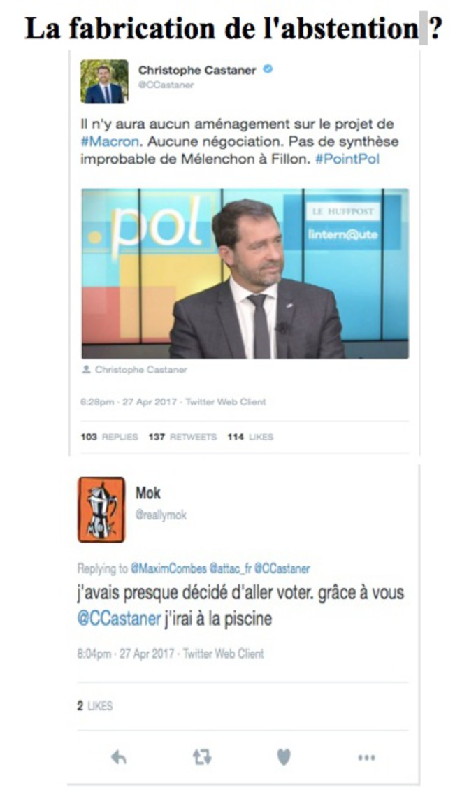 Evoquée, mais peu remarquée au soir du premier tour, cette orientation stratégique est triplement irresponsable. Irresponsable car les électeurs de Jean-Luc Mélenchon, Benoit Hamon et Philippe Poutou – qui font plus de 50 % des votants si on les additionne aux électeurs de Macron – ne partagent pas, c’est le moins que l’on puisse dire, les orientations programmatiques du candidat d’En Marche. On voudrait les encourager à s’abstenir ou voter blanc qu’on ne s’y prendrait pas autrement. Il ne faut pas chercher longtemps pour voir combien intimer un vote adhésion tout en déclarant combattre la gauche est vécue comme une provocation de plus. Une provocation de trop ? Nul ne le sait à cette heure, mais un candidat à la hauteur de la gravité de la situation devrait accueillir avec bienveillance et compréhension les électeurs désireux d’empêcher Marine Le Pen d’accéder à l’Elysée, plutôt que les provoquer gratuitement et inutilement.