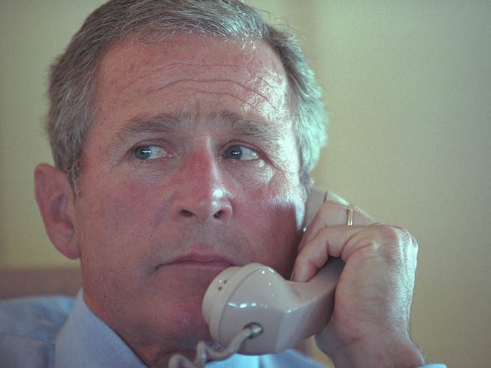George W. Bush le jour des attentats du 11 Septembre, qui ont servi à justifier publiquement l’invasion de l’Irak en 2003. Mais, selon de nombreux témoignages, le plan d’invasion de l’Irak avait déjà commencé à prendre forme plusieurs mois auparavant. Eric Draper/Archives nationales