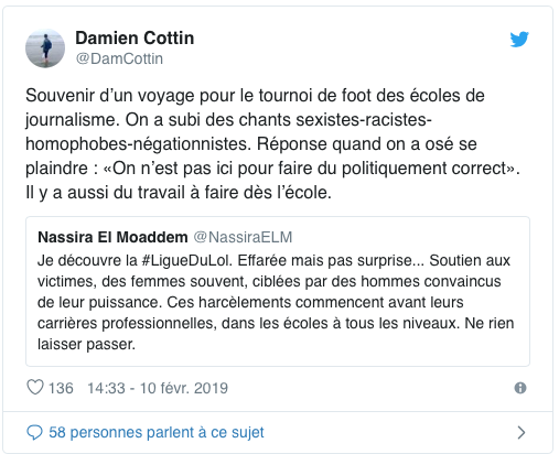 Du côté de Lille, c’est aussi dans le sillage de l’affaire de « la Ligue du LOL » que la parole s’est déliée. Mardi, alors que les élèves évoquaient, en cours, ce scandale et les discriminations au sein des rédactions, « des étudiants nous ont fait remonter qu’il y avait eu des propos anormaux, à l’extérieur de l’école, dans un bus » qui les menait à Strasbourg, à l’occasion du tournoi de football inter-écoles de février 2018, a expliqué le directeur de l’ESJ, Pierre Savary.