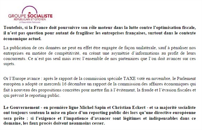 Alerter» asymétrie d’informations » …qui pénaliserait « nos » entreprises françaises – s’émeut le PS – comme si les infos concernant les filiales et aux faux-nez d’optimisation n’étaient pas archi connues de la concurrence ! il s’agit d’ INFORMATIONS – en même temps le PS a décidé de fouiller nos vies numériques sans retenue … pas d’infos techniques, comptables des personnes « morales » de sociétés multinationales et flicage des français … What else ?