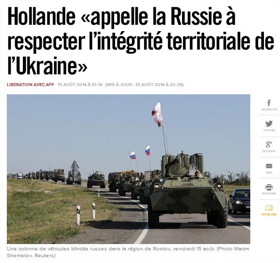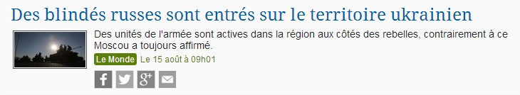 • Tout cela a commencé par deux articles du Guardian (le ) et du Telegraph (le 15 août 2014). Prenons par exemple le début du compte-rendu du Telegraph… (Précisons que Le Monde, notre “journal de références”, a repris la chose sans crier gare et le doigt sur la couture du pantalon, en bon petit soldat méritant du bloc BAO, sans l’ombre d’un conditionnel, le 15 août 2014 : «Des blindés russes sont entrés sur le territoire ukrainien».)