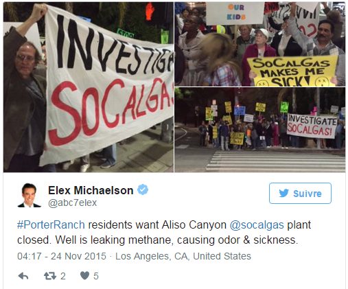 Quelle réactivité! Les premiers articles ont été publiés aux EUA dés les 28 octobre 2015 http://ktla.com/2015/10/28/porter-ranch-residents-concerned-about-leak-smell-from-gas-co-facility/ et 29 octobre http://www.sanfernandosun.com/news/article_3b03ff46-7e52-11e5-9aff-4bcb852a3ad0.html?mode=story. De manière très localisée Porter Ranch Neighborhood Council sur sa page Facebook signalait cette information le 26 octobre…