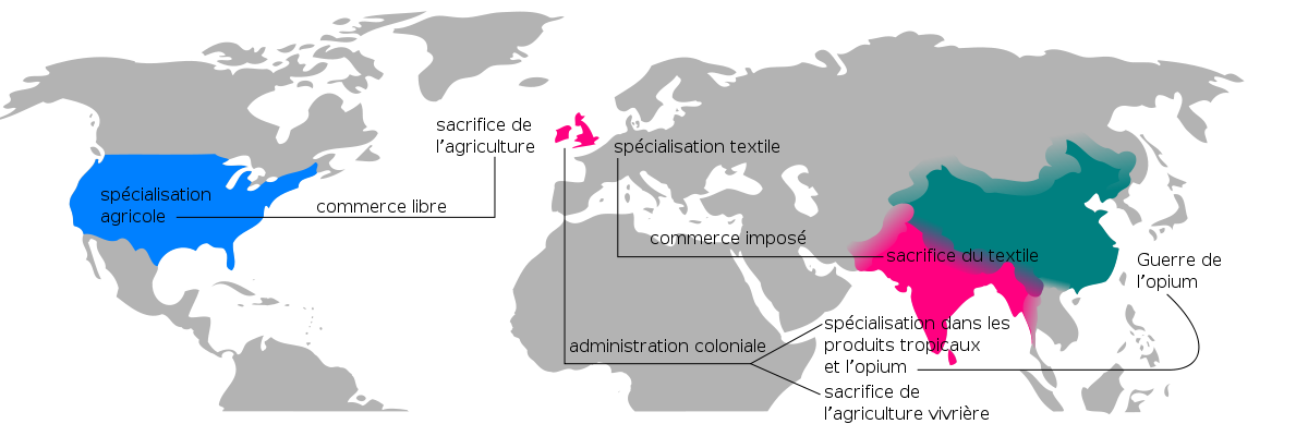 Les Britanniques mirent en place une division internationale de la production dans le cadre du plus grand empire de l’Histoire. Ils sacrifièrent leur agriculture au profit de l’industrie, selon la théorie des avantages comparatifs dont la logique fut décrite par David Ricardo.