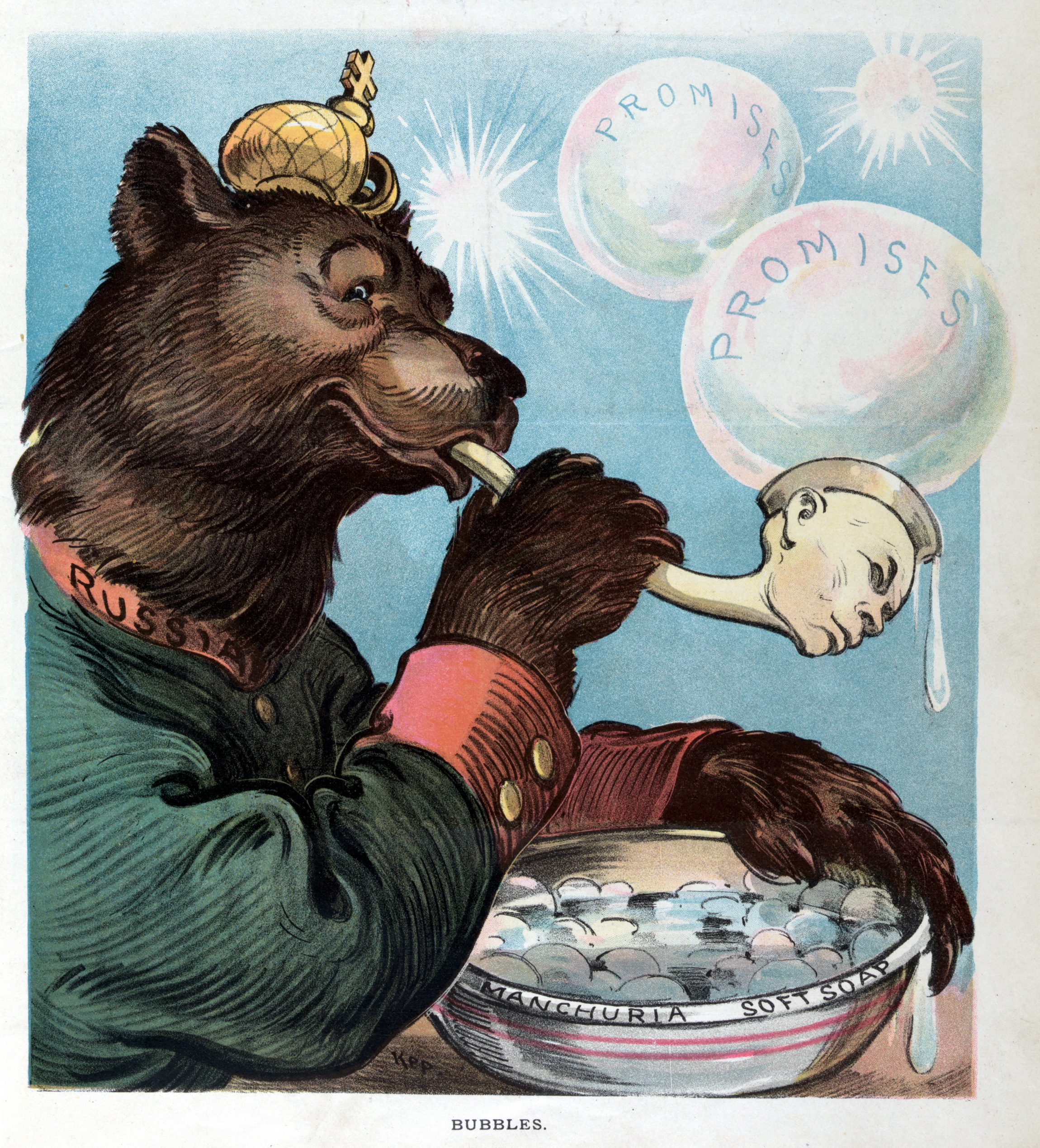 Le dessinateur montre l’ours russe en train de souffler des bulles de savon marquées « Promesses » à travers une pipe en écume de mer au visage chinois. Pour cela il utilise un bol marqué « Savon doux de Mandchourie ».