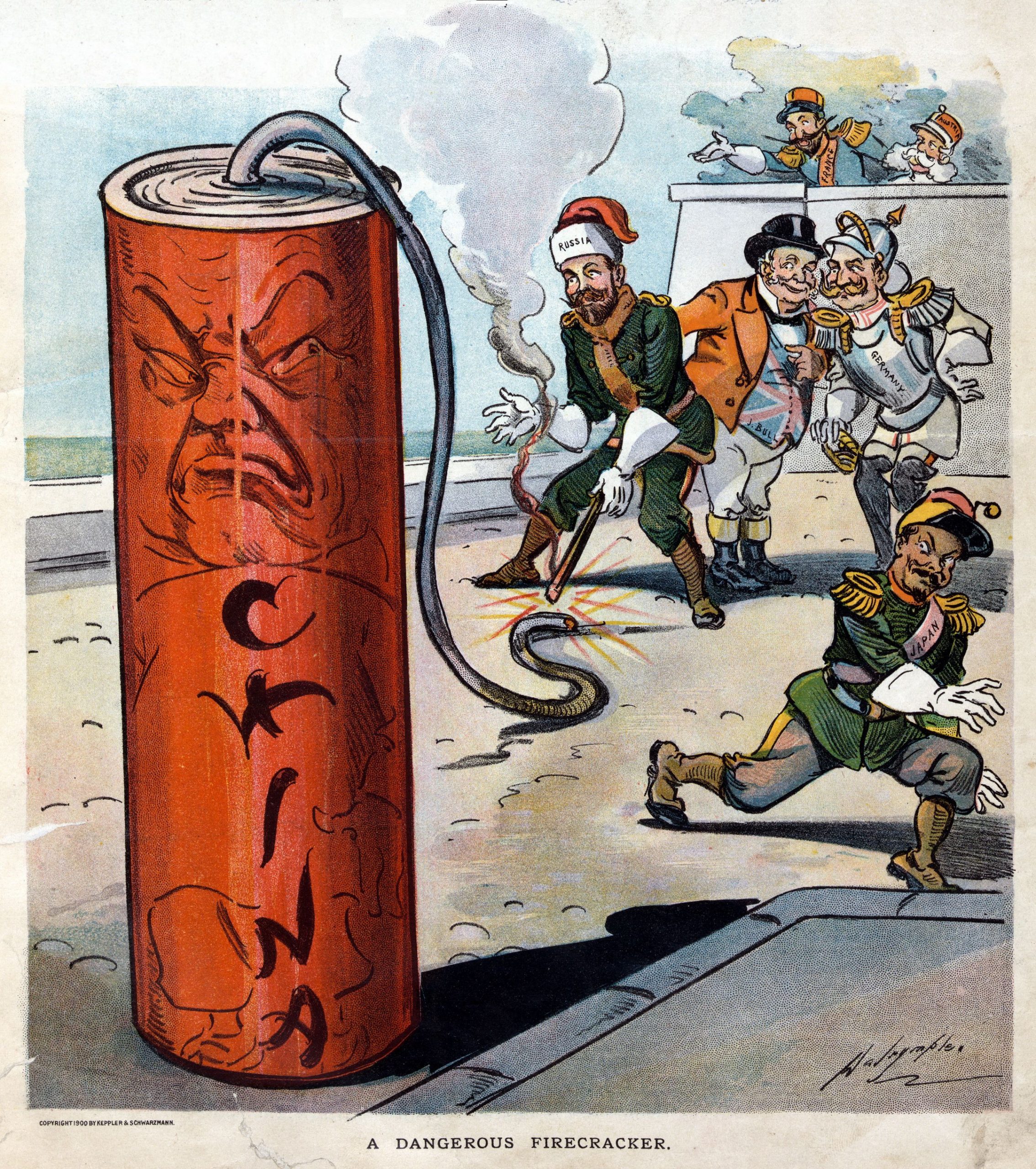 Le dessinateur montre les souverains d’Allemagne, de France, d’Autriche, du Japon ainsi que John Bull, représentant la Grande-Bretagne. Tous regardent le souverain de Russie allumer la mèche d’un grand pétard étiqueté Chine.