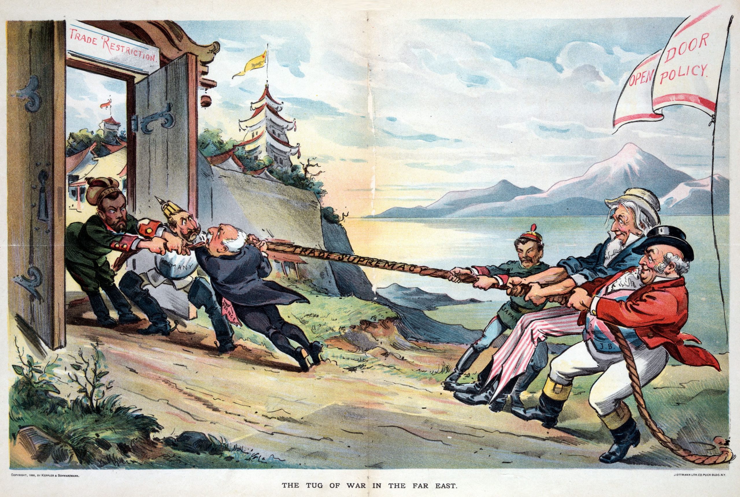 Ce dessin montre l’Oncle Sam avec John Bull (allégorie du Royaume-Uni) et Meiji, l’empereur du Japon, debout sous un drapeau portant la mention « Politique de la porte ouverte », dans un combat à la corde pour la « suprématie commerciale ». Ils sont opposés à la « Russie » (Nicolas II), à l' »Allemagne » (Guillaume II) et la « France » (Félix Faure) qui tirent la corde en direction des « Restrictions commerciales ».