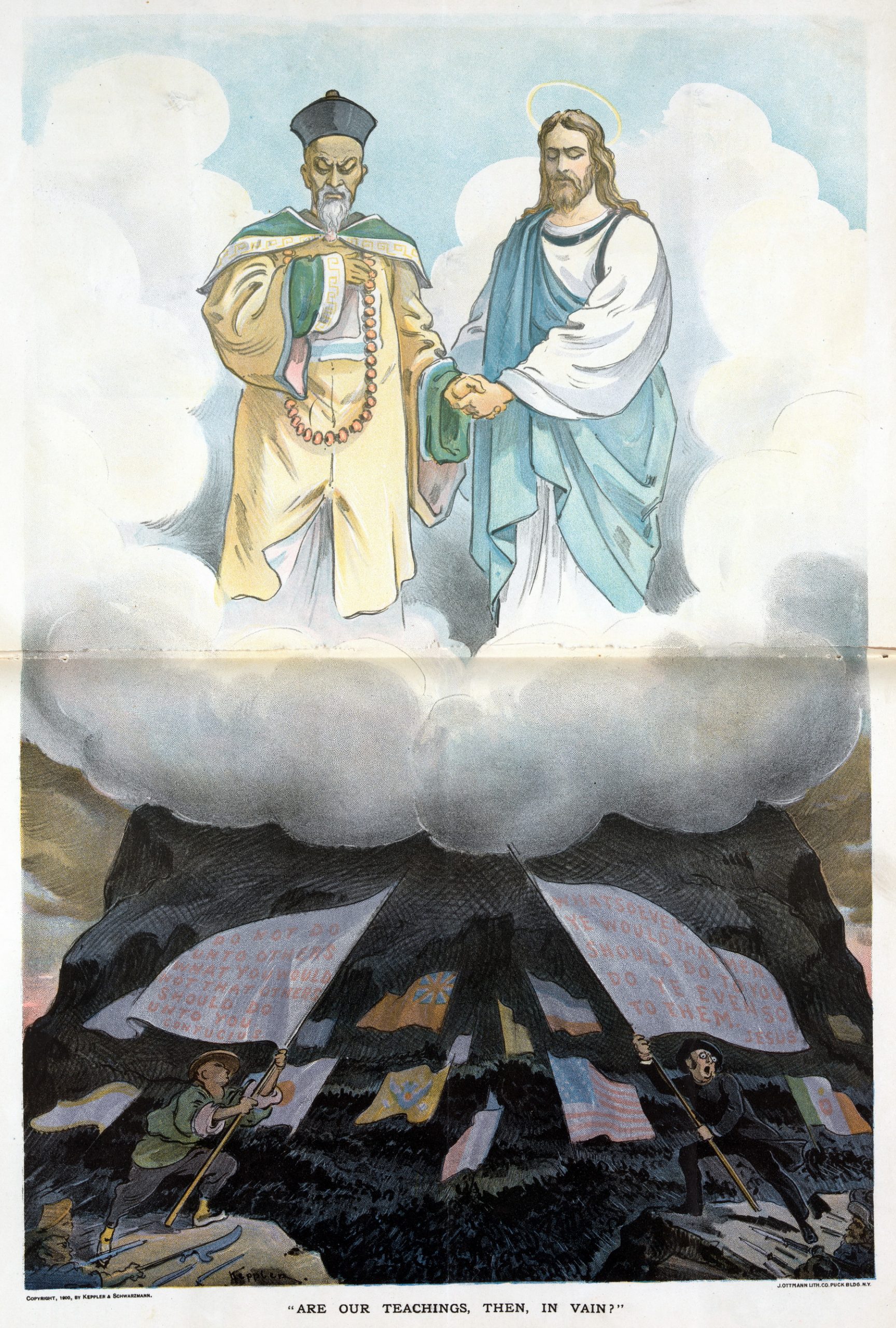 Confucius et Jésus-Christ observent la confrontation entre les Boxers et les forces de l’alliance des huit nations. Les Boxers portent une bannière avec une citation de Confucius [« Ce que tu ne voudrais pas que l’on te fasse, ne l’inflige pas »] et l’alliance internationale porte une bannière avec une citation de Jésus-Christ [« Ce que vous voulez que les hommes fassent pour vous, faites-le de même pour eux »], les deux exprimant le même concept.
