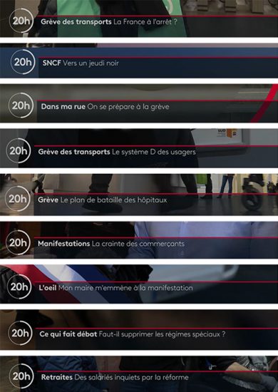 Mais alors, de quoi France 2 a-t-elle bien pu parler ? Eh bien de ce dont ont parlé la plupart de leurs confrères, comme nous l’avions noté dans le cas du Journal du dimanche et du Parisien : du coût des régimes spéciaux, de l’organisation des usagers, de la galère à venir, du micmac des patrons d’entreprises et, bien sûr, des risques de « dérapages » en série. En images, et les sujets sont exhaustifs, ça donne ceci [2] :