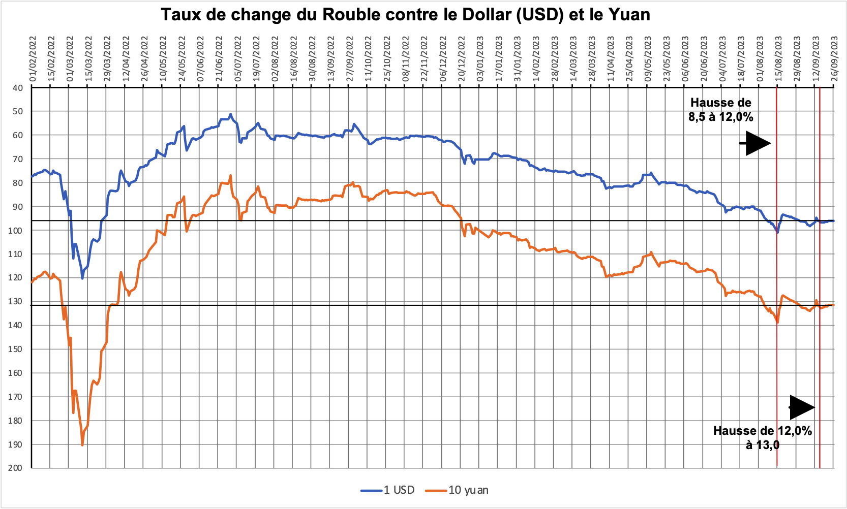 Assurément, on pouvait penser que le seuil psychologique de 100 roubles pour un Dollar serait franchi, et il le fut effectivement pour une très courte période. Et, psychologiquement, on pouvait effectivement craindre une déstabilisation des comportements des consommateurs. Mais, si l’on regarde le taux de change réel du rouble, compte tenu du fait que l’inflation avait été plus forte en Russie que dans les deux pays de références, le niveau du taux de change restait assez proche de son niveau de début 2022. Or, la Russie est en guerre, en dépit de l’utilisation de l’euphémisme « d’Opération Militaire Spéciale ». Il n’est pas étonnant, compte tenu du déficit budgétaire engendré par les opérations militaires et les dépenses qu’elles impliquent, que le taux de change du Rouble se soit légèrement déprécié. Sauf pour la raison psychologique cité plus haut, les raisons d’une intervention aussi brutale de la Banque Centrale ne semblent pas s’imposer.